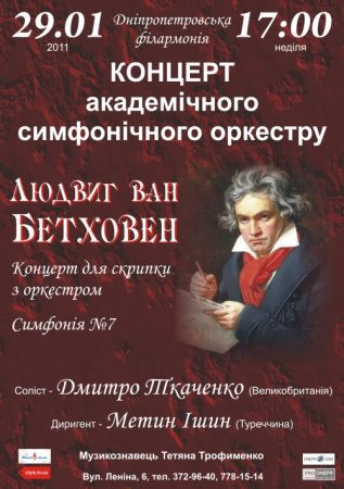 Музика 29.01 Концерт академічного симфонічного оркестру By Татьяна Иванова - 01.01.2012 00:00 0 13 Поділитися FacebookViberTelegramTwitterWhatsAppPinterestPrintEmail 29.01 (неділя) 17.00 Концерт академічного симфонічного оркестру У програмі: Л.ван Бетховен Концерт для скрипки з оркестром, Симфонія №7 Соліст Дмитро Ткаченко (скрипка), Лондон Диригент Метин Ішин (Туреччина)