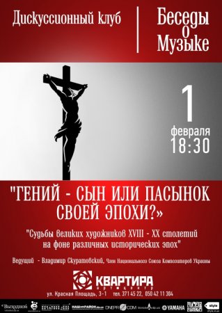 ГЕНИЙ – СЫН ИЛИ ПАСЫНОК СВОЕЙ ЭПОХИ? дискуссионный клуб 1 февраля, среда, в 18.30 арт-центр Квартира и дискуссионный клуб Беседы о музыке приглашают вас на встречу. Тема: ‘Гений – сын или пасынок своей эпохи? Особенность клуба Беседы о музыке в том, что вы сможете не только услышать замечательный рассказ ведущего, но и принять активное участие в дискуссии о судьбах великих художников ХVIII – XX столетий на фоне различных исторических эпох. Руководитель и ведущий клуба – Владимир Скуратовский (фортепиано). Начало: 18.30 Стоимость билета: 35 грн Действует система скидок! Билеты можно приобрести на входе.