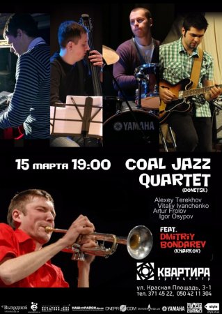 Сoal Jazz Quartet feat. Дмитрий Бондарев джазовый квартирник! 15 марта, четверг, в 19.00 арт-центр ‘Квартира’ приглашает вас на джазовый вечер с донецким коллективом Coal Jazz Quartet при поддержке Дмитрия Бондарева (труба), известного работой с Acoustic quartet, Аней Чайковской, Сергеем Бабкиным, Сергеем Давыдовым, Julian Tucker, Кузьма ‘Скрябин’, Karl Frierson.