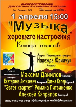 Музика 1 апреля, Дом органной и камерной музыки By Татьяна Иванова - 01.03.2012 00:00 0 15 Поділитися FacebookViberTelegramTwitterWhatsAppPinterestPrintEmail 1 апреля, Дом органной и камерной музыки
