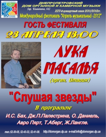 Музика 28 апреля, Дом органной и камерной музыки By Татьяна Иванова - 01.04.2012 00:00 0 10 Поділитися FacebookViberTelegramTwitterWhatsAppPinterestPrintEmail 28, Дом органной и камерной музыки 28 апреля Слушая звездыЛука Массалья (орган, Италия)Гость фестиваляИ.С.Бах, Дж.П.Палестрина, Авро Пярт, О.Диенель, Т.Аберг, Ж. Лангле. Начало: 18:00