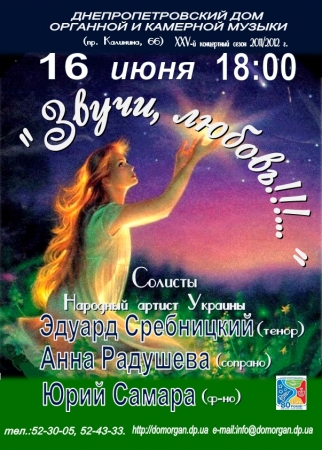 Музика 16 июня, «Звучи, любовь» By Татьяна Иванова - 05.06.2012 00:00 0 17 Поділитися FacebookViberTelegramTwitterWhatsAppPinterestPrintEmail 16 июня, Звучи, любовь Звучи, любовь Солисты Нар. арт. Украины Эдуард Сребницкий (тенор) Анна Радушева (сопрано) Юрий Самара (ф-но) Начало: 18:00