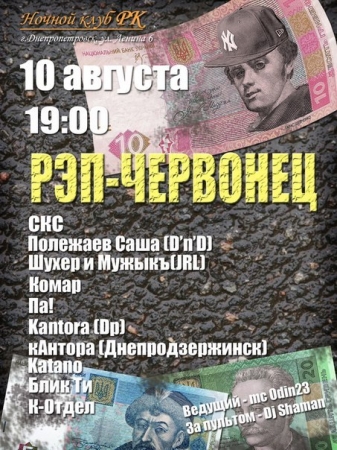 Рэп-вечерина, в которой примут участие 10 (червонец) групп из Днепра и Днепродзержинска. Самые первые представители днепровского хип-хопа, такие как СКС, Полежаев (D’n’D), Мужикъ, Комар и Китаец. Теплая, домашняя хип-хоп обстановка, пиво и фристайл ждут Вас!