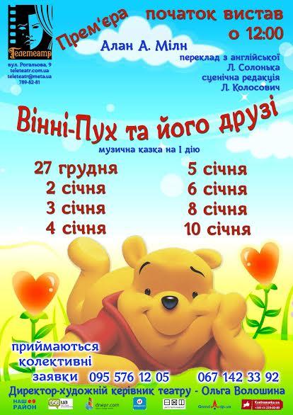Телетеатр представляє історію …надцять першу, оповідану Татом синові, історія про плюшевого ведмедика Вінні-Пуха та його друзів: поросятка П’ятачка, Сову, Кролика та Ослика Іа-Іа, історія про цікаві пригоди, вірну дружбу, горщик меду та… багато іншого, цікавого і смішного.