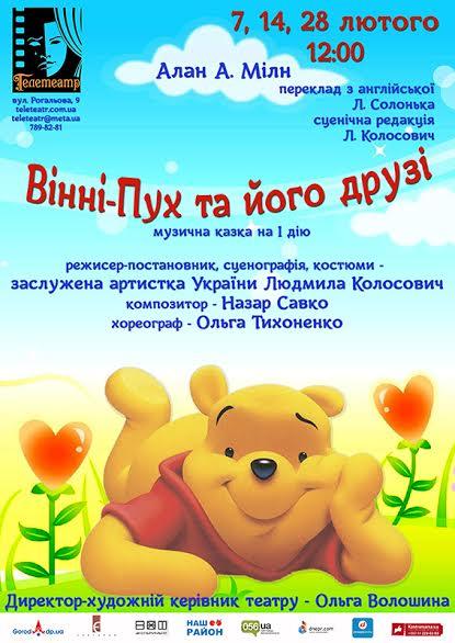 надцять першу, оповідану Татом синові, історія про плюшевого ведмедика Вінні-Пуха та його друзів: поросятка П’ятачка, Сову, Кролика та Ослика Іа-Іа, історія про цікаві пригоди, вірну дружбу, горщик меду та… багато іншого, цікавого і смішного.