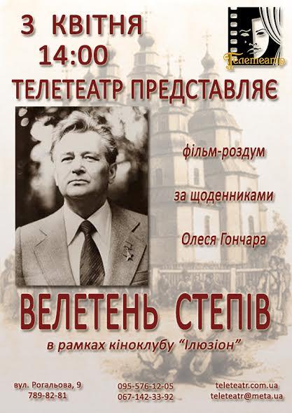 Запрошуємо на перегляд фільму-роздуму за щоденниками Олеся Гончара ‘Велетень степів’ (власна продукція Телетеатру). В телефільмі використано оригінальний текст щоденників письменника. Також екранізовані фрагменти його роману ‘Собор’.