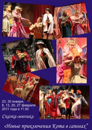 23, 30 января, а так же 6, 13, 20, 27 февраля 2011 года (то есть каждое воскресенье) в 11.00 мы ждем вас на сказку-мюзикл Новые приключения Кота в сапогах.