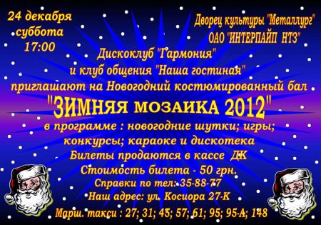 24 декабря во Дворце культуры ‘Металлург’ ОАО ‘ Интерпайп НТЗ’ дискоклуб ‘Гармония’ и клуб общения ‘Наша гостинная’ приглашают на