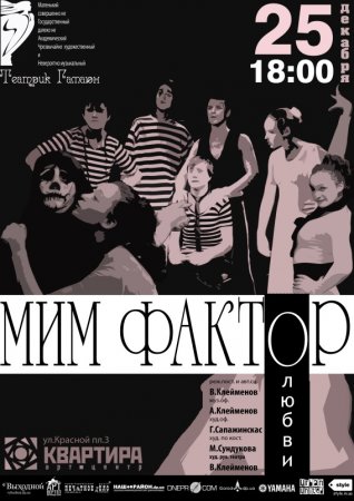 25 декабря в 18.00 арт-центр ‘Квартира’ вместе с театром ‘Гамаюн’ приглашают вас посмотреть новую версию спектакля ‘Мим-фактор’ (о любви).
