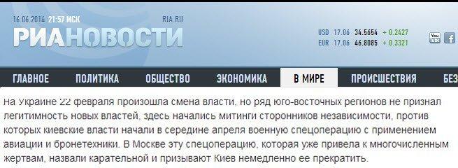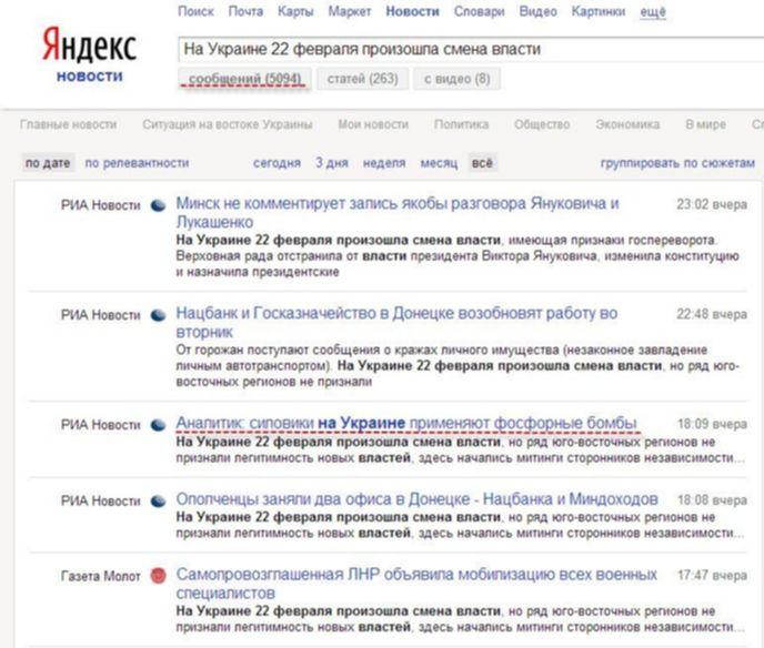 Сколько раз РИА Новости и ее партнеры повторили данную фразу за 3.5 месяца? Откройте сервис Яндекс.Новости, и вы увидите, что 5094 раза, в среднем по 50 раз в день, иногда через минуту (!), буквально в каждом сюжете об Украине.