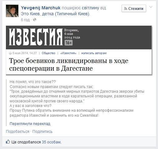 – ‘киевской хунте’, ‘карателях’, ‘фашистах’, ‘ополченцах Донбасса’ и их ‘мирных митингах’ против ‘киевской власти’, которая с ‘середины апреля начала карательную операцию’, приведшую к многочисленным жертвам,