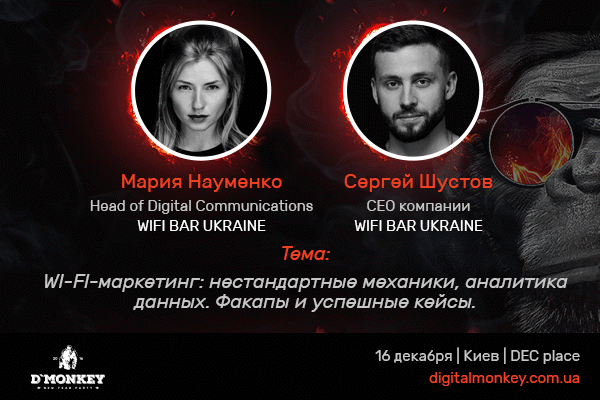 16 декабря в рамках конференции по цифровому маркетингу Digital Monkey эксперты в области альтернативных методов продвижения Сергей Шустов и Марина Науменко расскажут о том, как превратить точку доступа Wi-Fi в рекламную площадку.