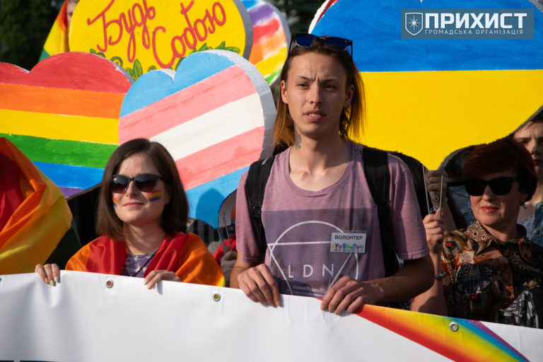 Из автобуса нас выгружали быстро, скомкано и суетливо. Несмотря на попытки затеряться в толпе, я как-то очутилась в первом ряду и меня тут же назначили левым флангом колонны. Видимо, затеряться пытались все и я оказалась самой неповоротливой. Участвовать так участвовать… Рядом со мной Леночка, Анжела (гетеросексуальная мама мальчишки-гея) и хлопец, которого я вижу впервые. Нам вручили баннер “#ВпередДоРівності” и проинструктировали куда и как шагать. Предводители, бляха…