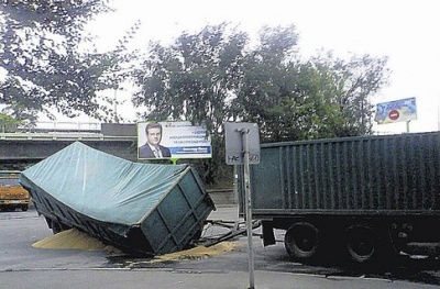 Вчера около четырех вечера в Днепропетровске на перекрестке улиц Пастера и Ленинградской на подъезде к заводу Днепромлын под грузовой фурой провалился асфальт. Как рассказала Сегодня сотрудница пресс-службы ГАИ города Ирина Снитько, на дороге образовался провал размером 1,5 метра в ширину и на 4 метра в длину. Предварительной причиной случившегося специалисты ГАИ, выехавшие на место происшествия, называют перегруз прицепа фуры зерном. Препятствий или каких-либо ям на дорожном покрытии в том месте не было. Информации о том, что кто-то из-за этого ДТП обращался к медикам, пока не было. Так как в провале оказался прицеп, а с грузовиком все нормально, то, скорей всего, пострадавших нет, рассказала Ирина Снитько.