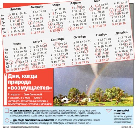 Любопытно, что Валерий Некрасов еще в конце прошлого года составил календарь критических дней на 2011 год для нашего региона, страны и даже мира. Я выделил так называемы черные, то есть опасные дни, которые будут влиять как на здоровье людей, так и на происходящие в мире события. Есть менее и более опасные. Из-за повышенной солнечной активности обилие различных катаклизмов будет преследовать планету до 2013 года, пока энергия солнечных лучей не поубавится. В этому году страшнее тех событий, которые произошли в Японии, ничего уже не будет. И атомным электростанциям, которые есть в нашей стране, в том числе и в городах, находящихся рядом с Днепропетровском, ничего не грозит, утверждает синоптик-самоучка. Согласно его прогнозу, самым опасным месяцем будет июнь, а самым спокойным был февраль. К слову, Некрасов собирается составить прогноз погоды на 100 лет вперед, достоверность которого, по факту, смогут оценить уже только наши потомки.
