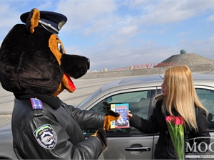 Сотрудники ГАИ переоделись в костюмы медведей символ областного управления ГАИ и, останавливая женщин-водителей, дарили им тюльпаны, светоотражающие фликеры, правила дорожного движения, а также мягких мишек.