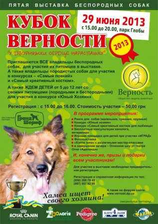 Общество защиты животных Верность приглашает вас на 5-ю Всеукраинскую выставку беспородно-бесподобных собак «Кубок Верности – 2013», девиз которой – «У дворняжки сердце нараспашку».