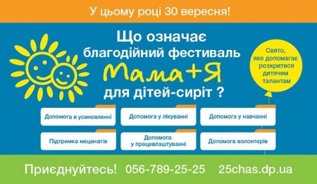 30 сентября этого года в г. Днепропетровске в креатив-клубе «Бартоломео» состоится седьмой благотворительный фестиваль «Мама + Я». Силами меценатов и волонтёров готовится незабываемый и долгожданный праздник для детей-сирот уже 7 год подряд. Число 7 для организаторов фестиваля – знаковая цифра! За эти годы и организаторы, и меценаты, и сами дети вывели для себя такие постулаты о достижениях фестиваля: Фестиваль «Мама+Я» – это помощь в усыновлении. Фестиваль «Мама+Я» – помощь в обучении. Фестиваль «Мама+Я» – помощь в трудоустройстве. Фестиваль «Мама+Я» – помощь в лечении. Фестиваль «Мама+Я» – это праздник, который помогает раскрыть детские таланты. Фестиваль «Мама+Я» – это поддержка меценатов Фестиваль «Мама+Я» – это помощь волонтеров. В этом году на праздник ожидается около 4 000 детей из детских домов и 359 приемных семей. «Призываем всех присоединится к нашей большой команде. Пусть все больше и больше детей на свете чувствуют себя счастливыми и нужными!» – говорят организаторы фестиваля «Мама+Я». Хотите присоединиться? Звоните: 056-789-25-25