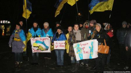 В руках они держали сине-желтые и красно-черные флаги, а также плакаты с надписями Не дай разорвать Украину, Присоединяйся к нам, Мы здесь за честность и др., сообщает корреспондент Радио Свобода.