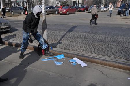 В Днепропетровске прошло Вече Победы. Со сцены звучали лозунги, молитвы и намеки на дальнейший план действий. В память о погибших были зажжены свечи и лампады. После официальной части люди с площади под Чкалова отправились к ОГА. На этот раз кордон правоохранителей их не встречал, все желающие могли беспрепятственно войти в здания. И вошли. Для того, чтобы вынести и уничтожить портреты Януковича и Колесникова. Их растоптали, осколки за собой аккуратно прибрали. Тем временем группа активисток организовала флешмоб: на деревьях под ОГА повесили ‘чучела’ самых ярких днепропетровских регионалов – Колесникова, Удода, Царева, Ступака и Вилкула. Как сообщают очевидцы, эти куклы висят там до сих пор. Именно на этом фоне будет проходить внеочередное заседание облсовета, в связи с которым организаторы просят всех неравнодушных к судьбе области людей собраться в 14:30 под ОГА.