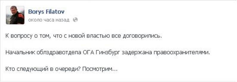 Начальник облздравотдела ОГА Гинзбург задержана правоохранителями, об этом на своей странице в Facebook сообщил заместитель губернатора Днепропетровской области Борис Филатов.