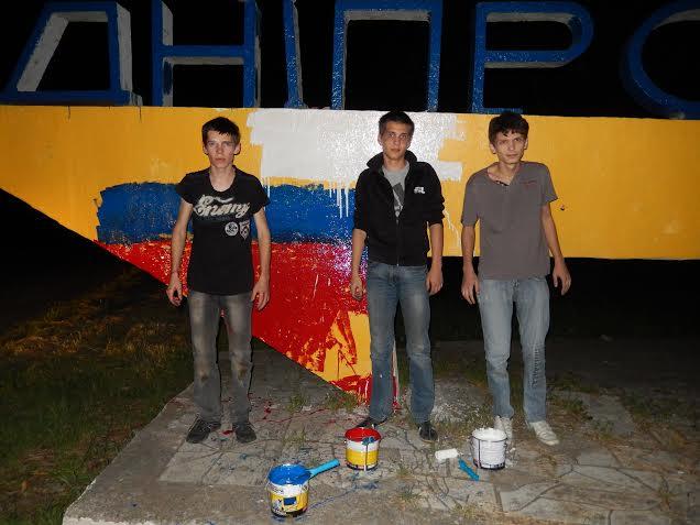 Сегодня около полуночи мобильная группа Правого Сектора задержала трех молодых 18-ти, 19-ти и 20-ти лет, студентов одного из местных вузов, которые красили стелу Днепропетровск при въезде в город со стороны Запорожского шоссе (в районе мемориала жертвам Голодомора и политических репрессий) в цвета российского флага. Об этом сообщила пресс-служба Правого сектора.