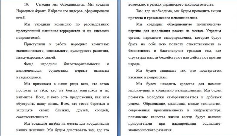 Вторник, 24 июня, в новообразованиях, именуемых ЛНР и ДНР прошел насыщенно. Аббревиатуры объединились в ‘Союз народных республик’, избрали правление, в которое вошли выдающиеся умы регионов: Павел Губарев, Олег Царев, Денис Пушилин, Александр Бородай, Алексей Карякин и Валерий Болотов, а также приняли конституцию. Об этом на своей странице в Facebook сообщил Олег Царев. Также беглый депутат разместил на своей странице скан-копии Манифеста народного фронта, согласно которому в эту организацию были непонятным образом включены Одесса, Николаев, Херсон, Запорожье, Харьков и, конечно же, Днепропетровск. Народный фронт собирается защищать мирных жителей от террора нацистских банд и дружить с Россией:
