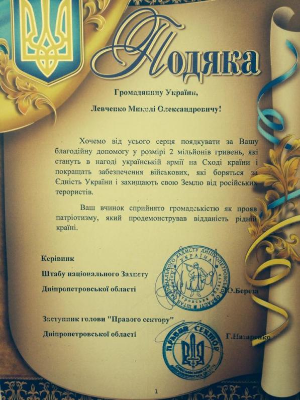Руководство Правого сектора и Штаба нацзащиты Днепропетровской области вынесло благодарность нардепу Николаю Левченко за 2 млн гривен, ‘пожертвованные’ украинской армии.