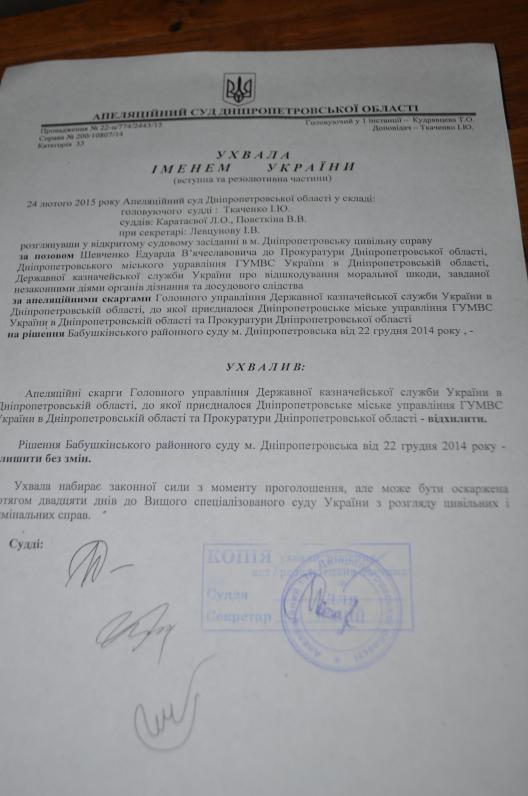 Сегодня, 24 февраля, в апелляционном суде Днепропетровской области рассматривалась апелляционная жалоба прокуратуры, госказначейства и городского управления ГУМВД на решение Бабушкинского районного суда о выплате моральной компенсации в размере 50 тысяч гривен Эдуарду Шевченко.