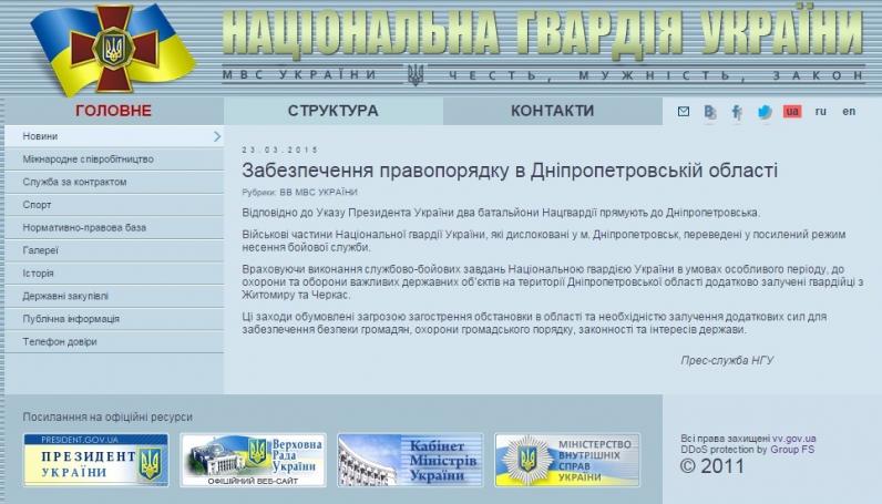 ’23 марта 2015 г с 12:00 до 15:00 часов неоднократно было осуществлено несанкционированное проникновение на официальный сайт Национальной гвардии Украины с целью распространения ложной информации провокационного содержания и закрепления данной информации в центре внимания средств массовой информации. Напоминаем, что в некоторых средствах массовой информации распространена информация, якобы о ‘… стягивании сил Нацгвардии в Днепропетровск’, которая не соответствует действительности’, – говорится в сообщении.