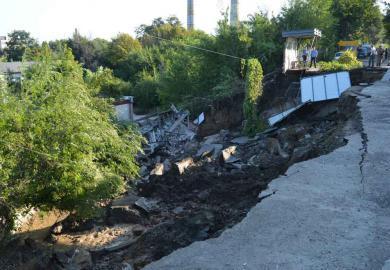На место происшествия отправились спасатели, которые установили, что общая площадь сдвига составляет около 560 кв. метров, глубина 10 метров. В результате оползня разрушено здание контрольно-пропускного пункта автобазы, произошел прорыв магистрального водопровода.