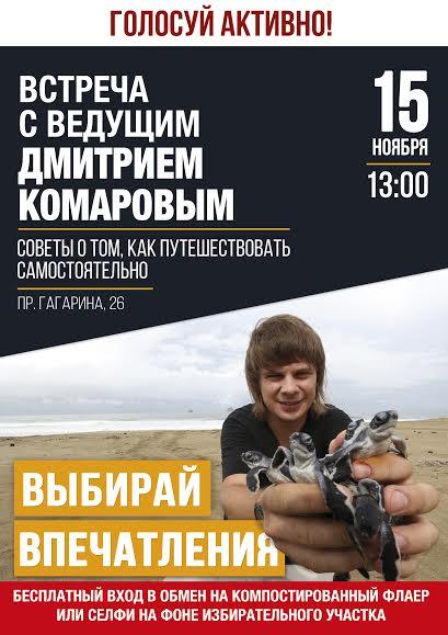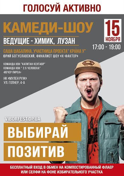 В воскресенье, 15 ноября, проект Голосуй активно! Выбирай! предлагает всем избирателям Днепропетровска обширную культурную программу, в рамках которой любой житель города найдет мероприятие себе по душе. Суть проекта заключается в том, чтобы уже проголосовавший днепропетровец смог провести выходной день интересно и с пользой для себя. При условии наличия селфи на фоне избирательного участка все творческие встречи, концерты и юмористические программы будут для горожан бесплатными.