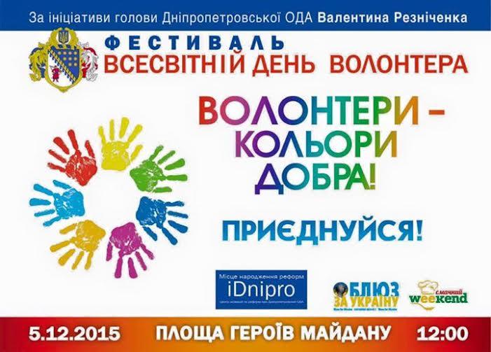 5 декабря Всемирный день волонтеров. Участие в нем примет и Днепропетровщина. Фестиваль Волонтери кольори добра пройдет в этот день в Днепропетровске на Площади Героев Майдана. В программе концерт, детские конкурсы, ярмарка еды и яркий флешмоб. Яркий в прямом смысле. Логотип нашего праздника разноцветные ладошки, – объяснил Валентин Резниченко. – Каждый цвет символизирует отдельное направление волонтерской деятельности. Поэтому мы предлагаем всем прийти на праздник и оставить цветной след своей ладони на белой ткани. Это и будет флаг волонтеров Днепропетровщины.
