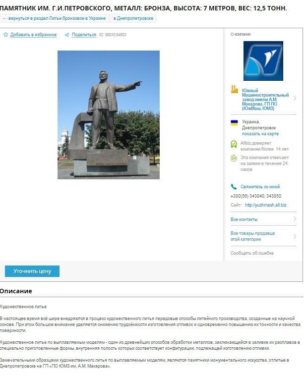 Южмаш, который изготавливал данный памятник, решил разместить объявление о его продаже. Цена не уточняется, но есть описание:
