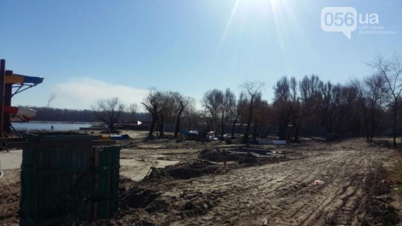 Строительство ведется прямо на берегу Днепра в районе реверсной водной канатной дороги. Территорию оградили высоким забором. Но сегодня в заборе появились технологические проемы для заезда транспорта, через который и смогли попасть журналисты.
