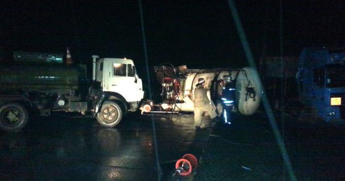 Бензин перекачали из опрокинутого автомобиля во второй грузовой автомобиль ДАФ с полуприцепом-цистерной.