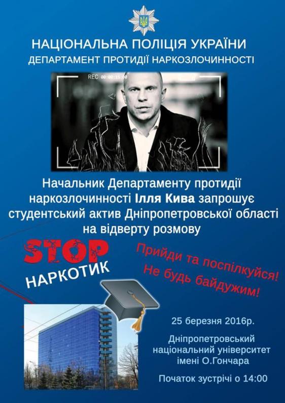 Стоп наркотик25 марта в Днепропетровском национальном университете им. Гончара полицейские проведут беседу с молодежью области. На откровенный разговор приглашает начальник Департамента противодействия наркотикам Илья Кива.