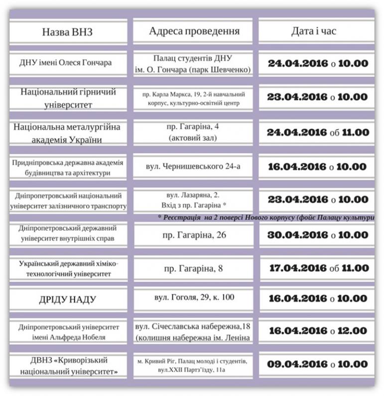 В субботу, 9 апреля, свои двери для будущих абитуриентов откроет Криворожский национальный университет. 23 апреля абитуриентов ждут в Национальном горном университете и Днепропетровском национальном университете железнодорожного транспорта им. академика В. Лазаряна. На следующий день, 24 апреля, Дни открытых дверей пройдут в Днепропетровском национальном университете им. О. Гончара и Национальной металлургической академии. В конце месяца, 30 апреля, узнать больше о поступлении в вуз приглашают в Университет внутренних дел.