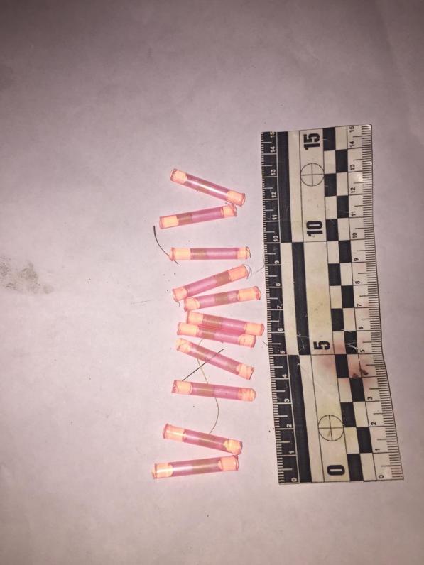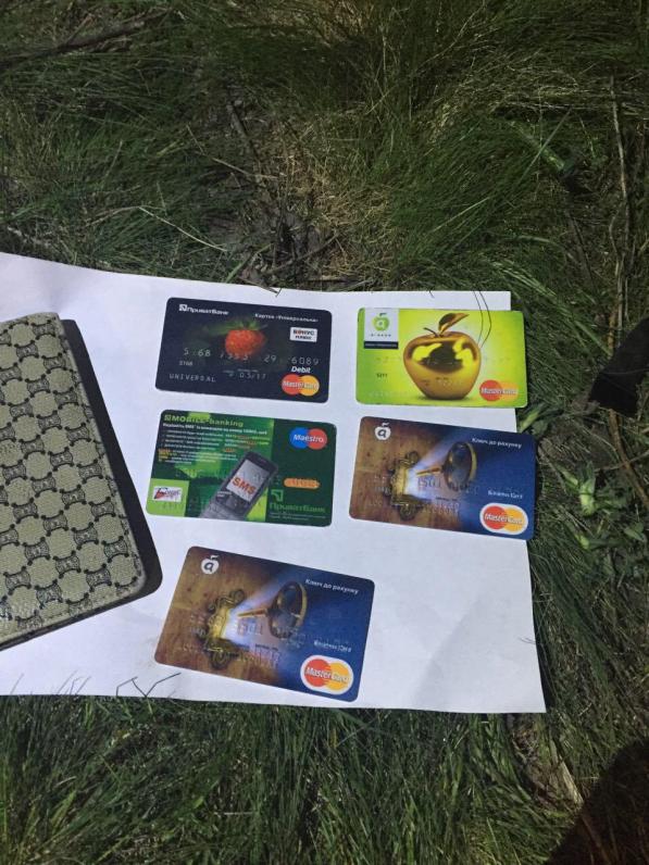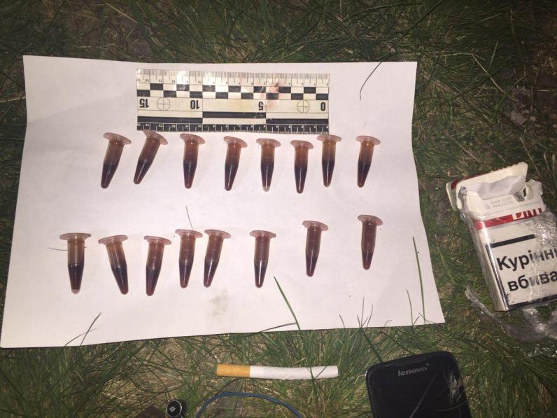 Во время поверхностного осмотра у драг-дилера были найдены пластиковые трубочки с метамфетамином, контейнеры с опием ацетилированным, многочисленные пластиковые карточки и кассовые чеки, одного из самых популярных коммерческих банков Украины контакты клиентов и боевая граната Ф-1.