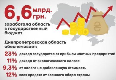 В 2015 году Днепропетровщина перечислила в государственный бюджет почти 31,2 млрд грн. Это 6% всего налогового дохода Украины. В этом году прогнозируются не меньшие показатели.