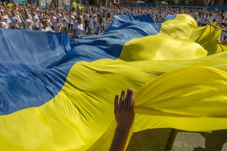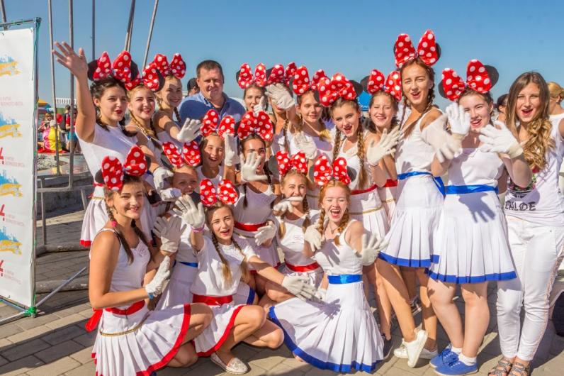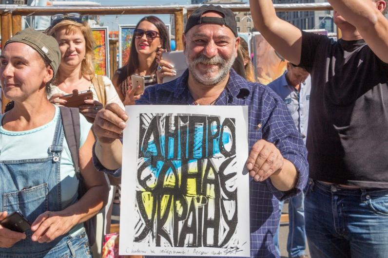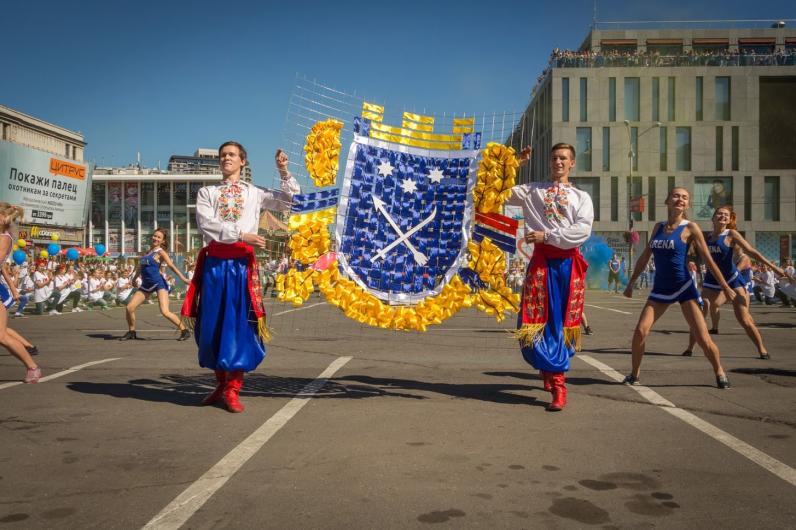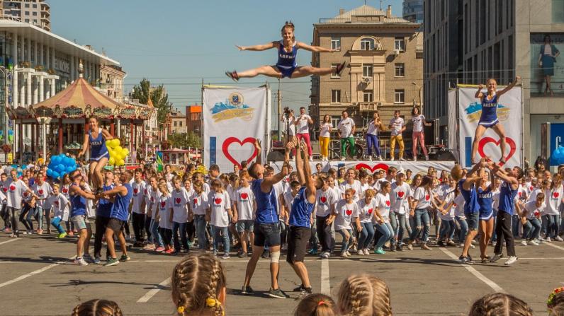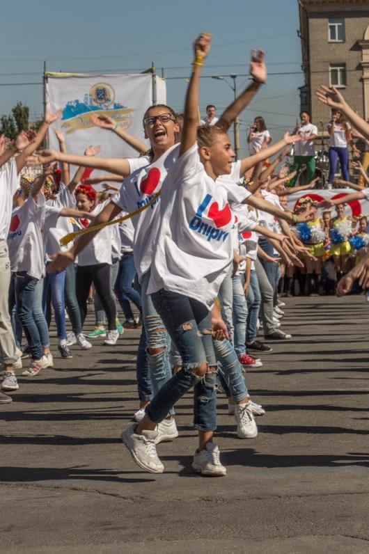 На площади во время танцевального флешмоба I love Dnipro развернули огромный украинский флаг. Также здесь устроили показательные выступления роллеров и черлидеров. Флешмоб завершили запуском в небо сотен желто-синих шариков.