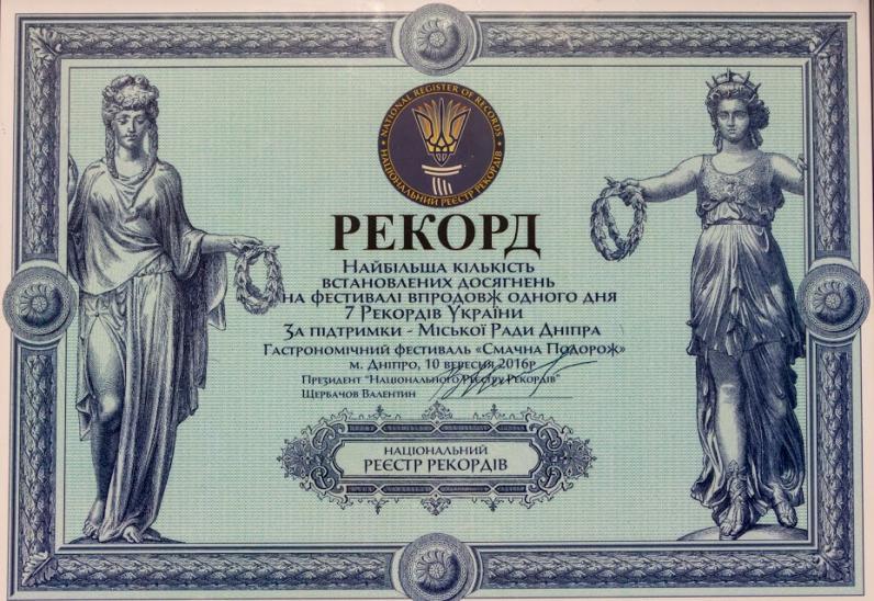 Не скучали горожане и на Набережной. Там устроили Вкусное турне. Во время гастрономического фестиваля установили целый ряд рекордов. Свидетельство о чрезвычайных кулинарные достижения города вручили мэру Днепра Борису Филатову. В Книгу рекордов Украины внесли сразу 7 достижений. Среди них – самое большое карамельное панно размером 1х1,5 метра, наибольшая тарелка мясных деликатесов, самый большой бар, построенный из баночек с орехами, и наибольшее количество логотипов, нарисованных хной. На набережной провели также кулинарную эстафету. За час горожанам удалось нашинковать 457 кг капусты. Соревнования также удостоили места в общенациональном списке рекордов.