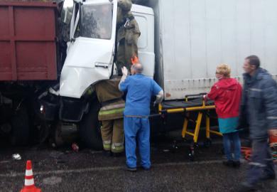 Спасатели установили, что в ДТП столкнулись 2 грузовика МАЗ. В результате ДТП одного из водителей зажало в автомобиле.