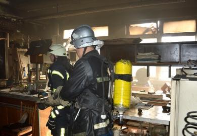 Через окно по лестнице, в составе звена газодымозащитной службы, спасатели попали в помещение лаборатории и приступили к тушению пожара.