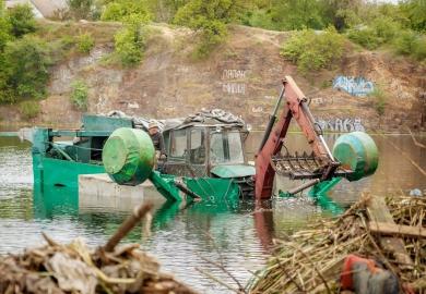 Расчистку искусственного озера планируют закончить в течение лета. На воде работает специальная техника, которая собирает мусор на глубине 5 метров. После этого за дело берутся водолазы.