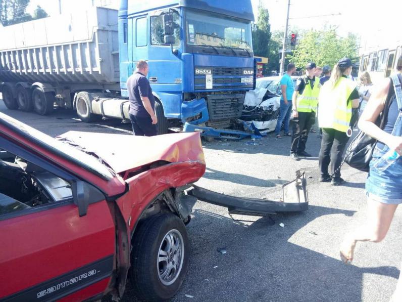 Один из легковых автомобилей, который ехал по Слобожанскому проспекту, проехал на желтый. В этот момент на перекресток со стороны Байкальской выезжал второй легковой автомобиль, фура двигалась также по Байкальской на встречу легковушке. В результате первый легковой автомобиль задел вторую легковушку и вылетел на фуру.