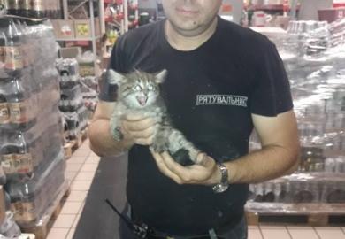 Работники одного из супермаркетов Каменского вечером услышали громкое мяуканье со стороны технического этажа. Прибывшие на место спасатели нашли застрявшего там котенка.