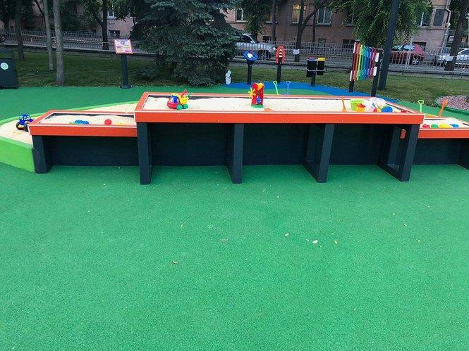 Огромная песочница. Она разноуровневая. Опять же может использоваться и обычными детками и детками на колясках, которым удобно к ней подъезжать и играть в ней.