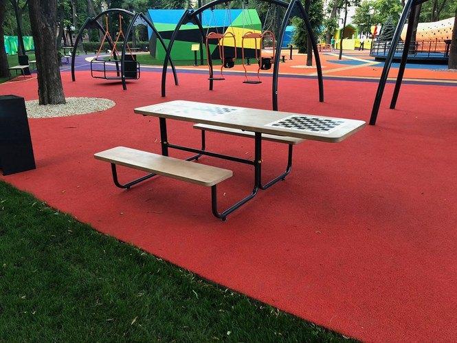 Шахматные столы. Мы подумали, что если есть столы, почему не нанести на них шахматную доску? Но столы могут использоваться как обычными людьми – для этого есть лавочки, так и людьми на колясках, для этого достаточно просто к столу подъехать. Наши столы консольные.