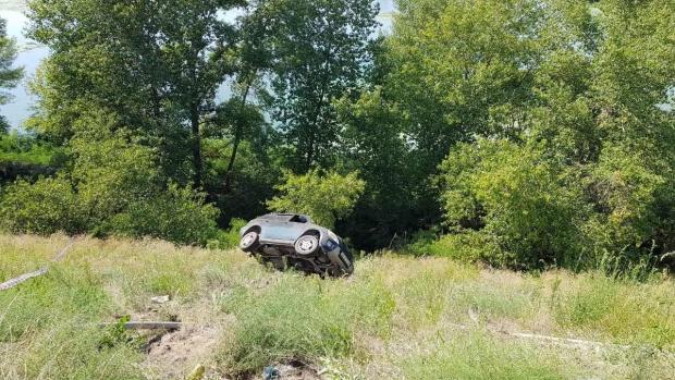 Автомобиль упал в балку возле моста, от падения в воду его удержали деревья.